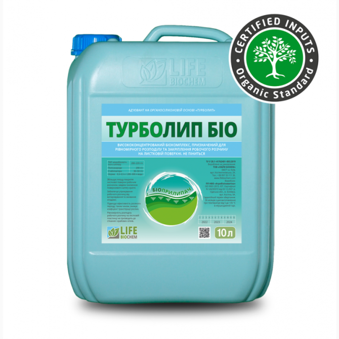 **Турболіп Біо** *Прилипачливий ад'ювант на органосиліконовій основі* Турболіп Біо - це висококонцентрований біокомплекс, розроблений для рівномірного розподілу та закріплення робочого розчину на листковій поверхні. Цей продукт не піниться. **Склад:** - ПАР мікробіологічного синтезу: 200 –...