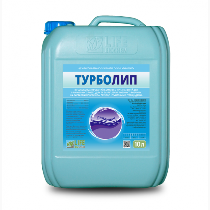 **Турболіп Біоприлипачливий** Турболіп Біоприлипачливий - це висококонцентрований біокомплекс на органосиліконовій основі, призначений для рівномірного розподілу та закріплення робочого розчину на листковій поверхні. Цей ад'ювант не піниться. **Склад:** - ПАР мікробіологічного синтезу: 200 – 220 г...