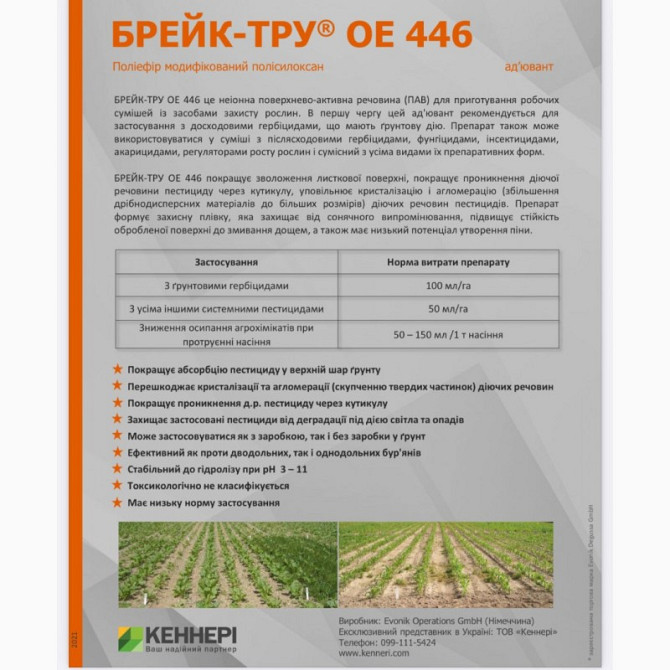БРЕЙК-ТРУ OE 446 є неіонною поверхнево-активною речовиною, призначеною для приготування робочих сумішей із засобами захисту рослин. Цей ад'ювант рекомендований для застосування з досходовими гербіцидами, які мають ґрунтову дію. Препарат також може використовуватися у суміші з післясходовими гербіцид...
