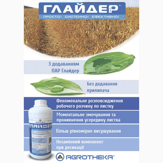 Прилипач Глайдер використовується для підвищення ефективності застосування пестицидів. Цей продукт призначений для поліпшення змочування поверхні листків бур'янів та покращення проникнення гербіцидів, пестицидів та інших засобів захисту рослин. При допомозі прилипача Глайдер робочий розчин краще п...