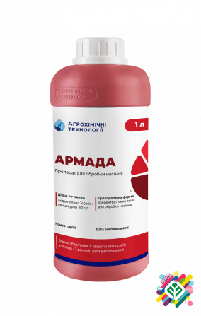 Пропозиція від компанії-виробника "Агрохімічні технології" щодо протруйників оптово та в роздріб: 1. **Армада** (банка 1л) - містить імідаклоприд у концентрації 140 г/л та пенцикурон у концентрації 150 г/л. Товарна категорія: ТК. Ціна: 27,94 українських гривень. 2. **Ларімар** (каністра 5л) - міст...