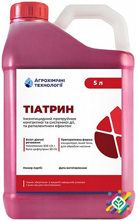 **Протруйник Тіатрин** **Діючі речовини:** Тіамитоксам 500 г/л, Бета-цифлутрин 50 г/л **Форма:** Концентрована тягуча рідина **Тара:** Пластикова каністра, об'ємом 5 л **Культура:** Пшениця, ячмінь, соя, ріпак, соняшник, кукурудза **Об'єкт знищення:** Основні наземні та ґрунтові шкідники **Тем...