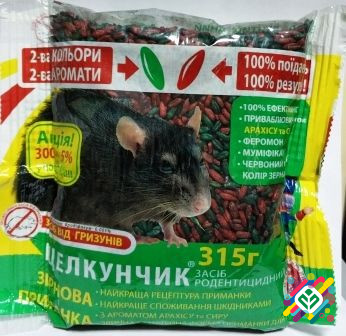 **Зернова приманка "Щелкунчик Зерно 315 г"** "Щелкунчик Зерно 315 г" - це зернова приманка з ароматом сиру, готова до застосування для знищення щурів та мишей. Завдяки вдосконаленому рецепту приманки гарантується 100% знищення гризунів. Склад приманки включає сирний аромат, феромон та муміфікатор. ...