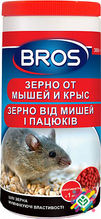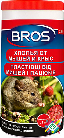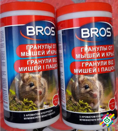 Гранули від мишей і щурів Bros 250 г Гранульований родентицид для боротьби з мишами, щурями та іншими гризунами. Високу ефективність препарата гарантують: - кормова привабливість для гризунів; - ефект дії препарата виявляється через 4-5 днів з моменту подачі, гризуни при цьому не пов'язують загибел...
