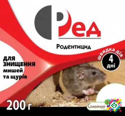 Рід - швидкодіючий та ефективний родентицид для знищення всіх видів шкідливих гризунів (сірих і чорних крис, домашніх і полевих мишей) в домашніх господарствах (будинки, підвали та ін.), на виробництвах та складах, на полях та сільськогосподарських угіддях. Діюча речовина: бродіфакум 0,005%. Засто...