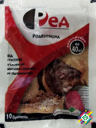 Мінімальна сума замовлення - 350 грн. В наявності є брикети та тісто. РЕД - швидкодіючий та ефективний родентицид для знищення всіх видів шкідливих гризунів (сірих і чорних крис, домашніх і полевих мишей) у домашніх господарствах (будинках, підвалах і т.п.), на виробництвах і складах, на полях та ...
