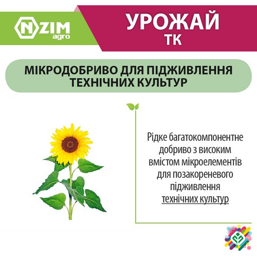 ТК Рідке багатокомпонентне добриво з високим вмістом мікроелементів для позакореневого підживлення технічних культур. Оптимальне співвідношення мікроелементів у легкодоступній формі, у поєднанні з хелатизованими сполуками EDTA та комплексом органічних кислот, дозволяє активізувати процеси фотосинтез...
