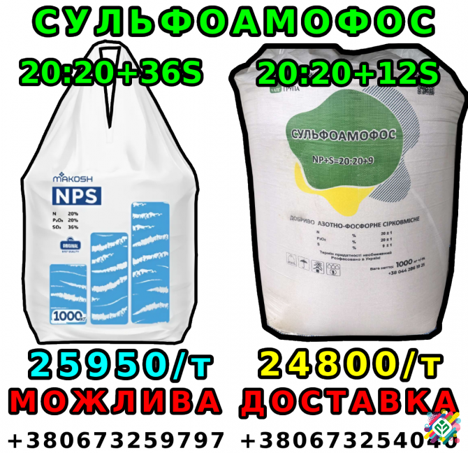 Мінімальна партія - 1 біг-бег (самовивіз) від 20 тонн - безкоштовна доставка в радіусі 150 км від Кропивницького. Наше підприємство постійно здійснює поставки мінеральних добрив, завжди в наявності на складах. Азотні добрива: Карбамід, Аміачна селітра, Сульфат амонію; Комплексні добрива: Амофос 12...