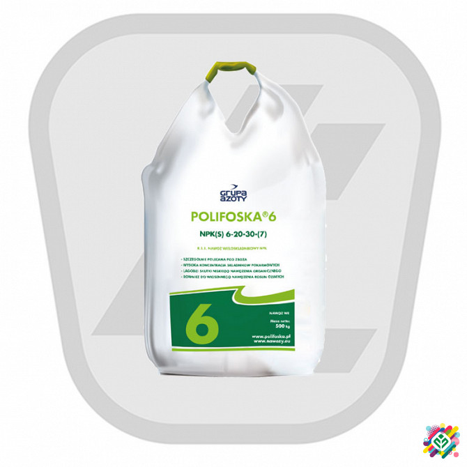 **Поліфоска 6 NPK(S) 6-20-30-(7) (POLIFOSKA 6)** **Опис:** Поліфоска 6 (POLIFOSKA 6) - це універсальне добриво, яке підходить для всіх видів сільськогосподарських культур як для основного, так і для післяпосівного внесення. Це ідеальний вибір для культур, які потребують підвищеного калієвого живлен...