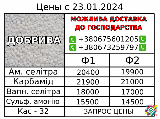 NP+S 20:20+12 (Греція, 1т) NPK+S 15:15:15+10S (Марокко, 1т) Карбамід (Туркменістан, 1т) Аміачна селітра (Туреччина, 1т) можлива доставка до господарства