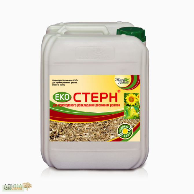 **Екостерн - біодеструктор стерну** **Опис:** Екостерн - це рідина від кремового до коричневого кольору зі слабким специфічним запахом, яка містить у своєму складі ряд корисних компонентів: - бактерії-антагоністи патогенних грибів для рослин; - калій- та фосформобілізуючі грунтові бактерії; - приро...