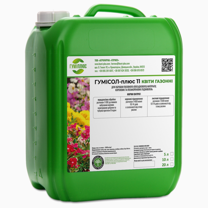 Гумісол-плюс 11 Квіти газонні є рідким препаратом гумінової природи, який виготовляється на основі вермікомпосту, продукту переробки гною ВРХ за допомогою черв'яків Eiseinia fetida. Цей препарат спеціально розроблений для газонних квітів, таких як цибулинні (тюльпани, нарциси, крокуси і т.д.). Він м...