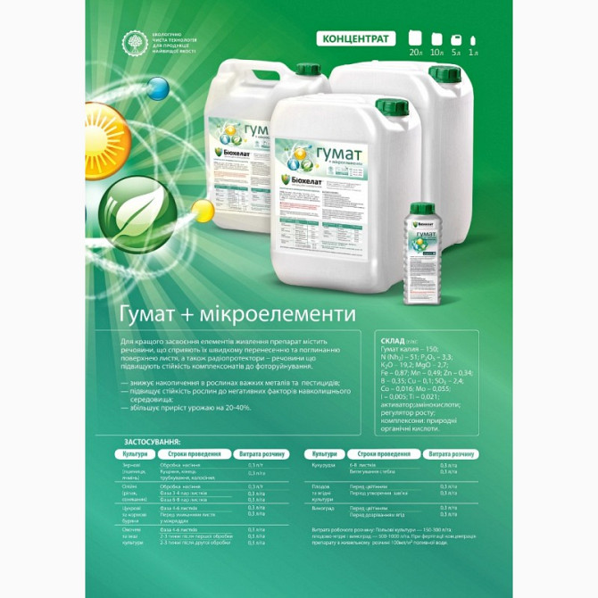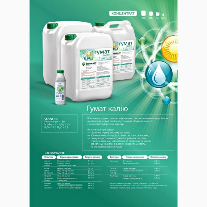 **Гумат калію: органомінеральний препарат для підживлення рослин** Гумат калію - це рідкий органомінеральний препарат, який містить гумінові кислоти. Цей продукт комплексно впливає на основні процеси життєдіяльності рослин, такі як фотосинтез, ріст пагонів та розвиток кореневої системи. **Характер...