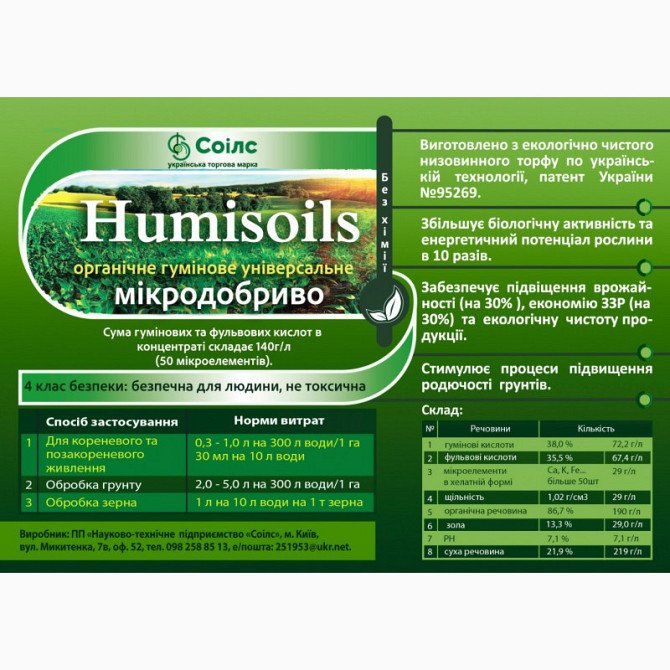 Органічне добриво "Humisoils". МІКРОДОБРИВО «HUMISOILS». Склад: Високоочищене гумінове речовина, виготовлене з низинного торфу з високим вмістом гумінових та фульвових кислот. Фульвова та гумінова кислота виділені з торфу або сапропелю представляють собою найдрібнішу частинку цього сировини. Молекул...