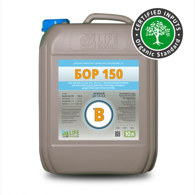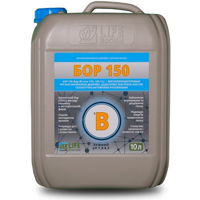 Бор 150 (Лужний) є висококонцентрованим органо-мінеральним добривом у вигляді коламіну, додатково збагаченим азотом. Склад продукту на 1 л містить 150 г бору (В) та 75 г азоту (N) при рН 7,8 – 8,2. Бор 150 (w/w 11%) є висококонцентрованим органо-мінеральним добривом, додатково збагаченим азотом і б...