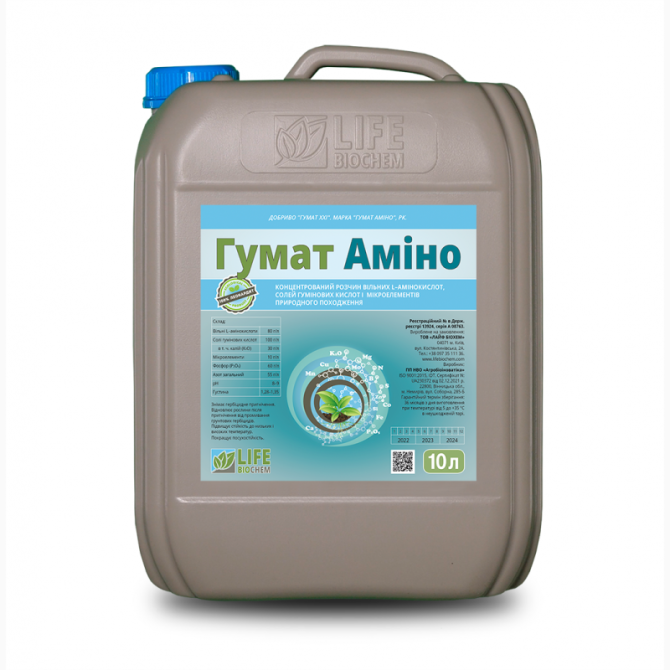 **Гумат Аміно: Концентрований розчин вільних L-амінокислот, солей гумінових кислот та мікроелементів природного походження** **Склад:** - Вільні L-амінокислоти: 80 г/л - Солі гумінових кислот: 100 г/л, у т.ч. (K2O): 30 г/л - Мікроелементи: 10 г/л - Фосфор (P2O5): 60 г/л - Азот загальний: 55 г/л - p...