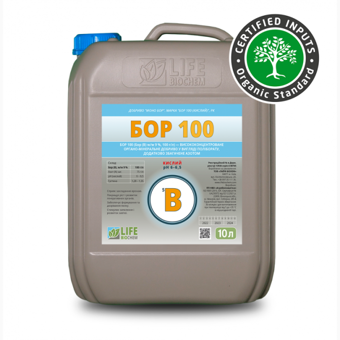 Бор 100 (Кислий) - висококонцентроване органо-мінеральне добриво у вигляді коламіну, додатково збагачене азотом. Склад: - Бор (В) w/w 9%, 100 г/л - Азот (N) 75 г/л - pH 6 – 6,5 Бор 100 (w/w 9%) є висококонцентрованим органо-мінеральним добривом, яке додатково збагачене азотом і біологічно-активни...