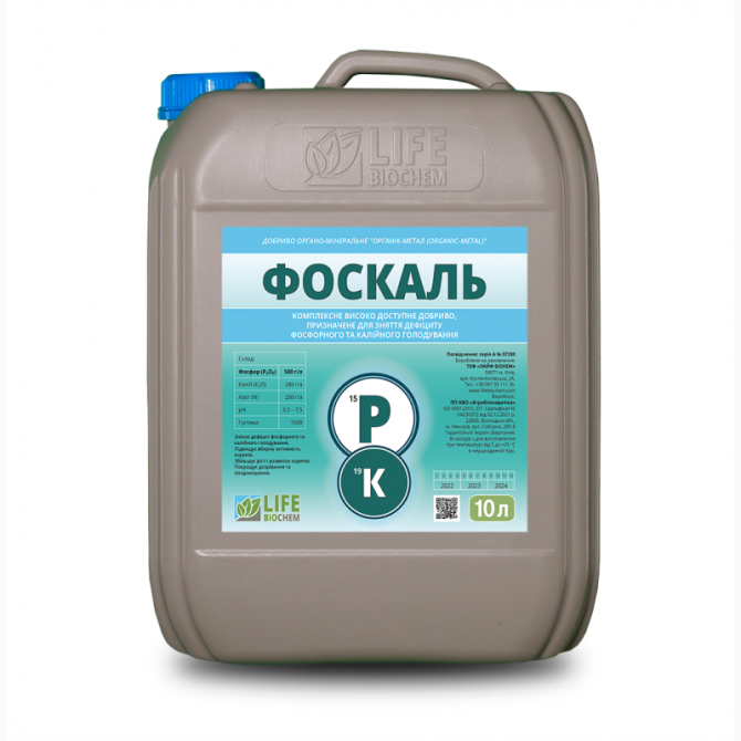 **Фоскаль** **Комплексне високодоступне добриво, призначене для зняття дефіциту фосфорного та калійного голодування.** **Склад:** - Калій (K₂O): 280 г/л - Азот (N): 200 г/л - Фосфор (P₂O₅): 500 г/л - pH: 6,5–7,5 - Густина: 1500 **Як це працює:** Фоскаль - це інноваційна формула, яка підвищує вбир...