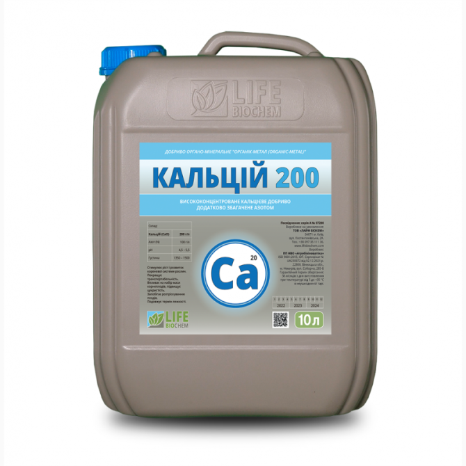 **Кальцій 200: Висококонцентроване кальцієве добриво додатково збагачене азотом** **Склад:** - Кальцій (CaO) 200 г/л - Азот (N) 100 г/л - pH: 4,5 – 5,5 - Густина: 1350 – 1400 **Як це працює:** Кальцій 200 - завдяки активному органічному комплексу препарат швидко проникає в клітину та утворює сполу...