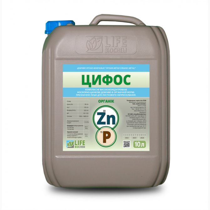 **ЦИФОС (органік) - КОМПЛЕКСНЕ ВИСОКОКОНЦЕНТРОВАНЕ ФОСФОРНО-ЦИНКОВЕ ДОБРИВО В ОРГАНІЧНІЙ ФОРМІ** Цифос (органік) - це добриво, що містить фосфор та цинк у висококонцентрованій органічній формі, призначене виключно для листкового обприскування. **Склад:** - Цинк (Zn) - 90 г/л - Азот (N) - 135 г/л -...