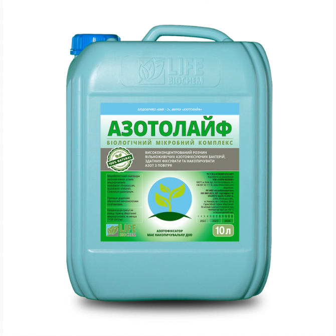 **Азотолайф**: висококонцентрований розчин вільноживучих азотофіксуючих бактерій, здатних фіксувати та накопичувати азот з повітря. **Склад:** - Мікробіологічний консорціум високоактивних штамів мікроорганізмів: Azotobacter chroococcum, Azotobacter vinelandii, Сlostridium pasterianum. - Препарат до...