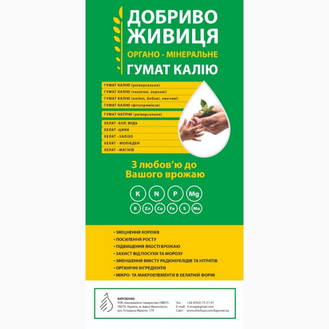Органо-мінеральне добриво "ЖИВИЦЯ" на основі гумату калію призначене для підживлення всіх сільськогосподарських культур під час вегетації. Це добриво забезпечує приріст врожаю до 30% та покращує якість урожаю шляхом активізації фізіологічних процесів рослин. Гумат калію сприяє підвищенню стійкості р...
